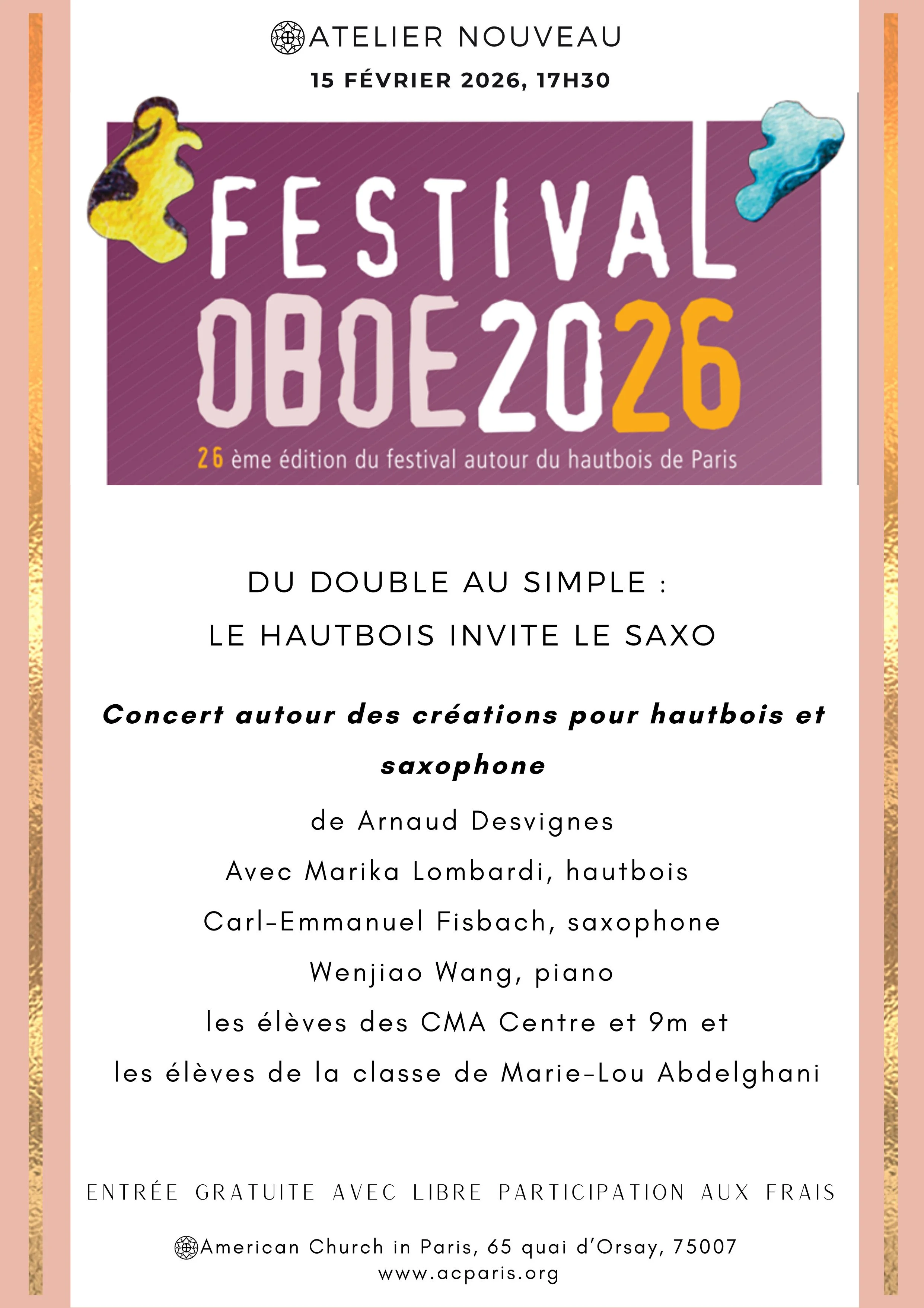 Festival Oboe musicians including oboists, a saxophonist and a pianist will present “From Double to Single: When the Oboe Meets the Saxophone.” Free entry with free-will offering.