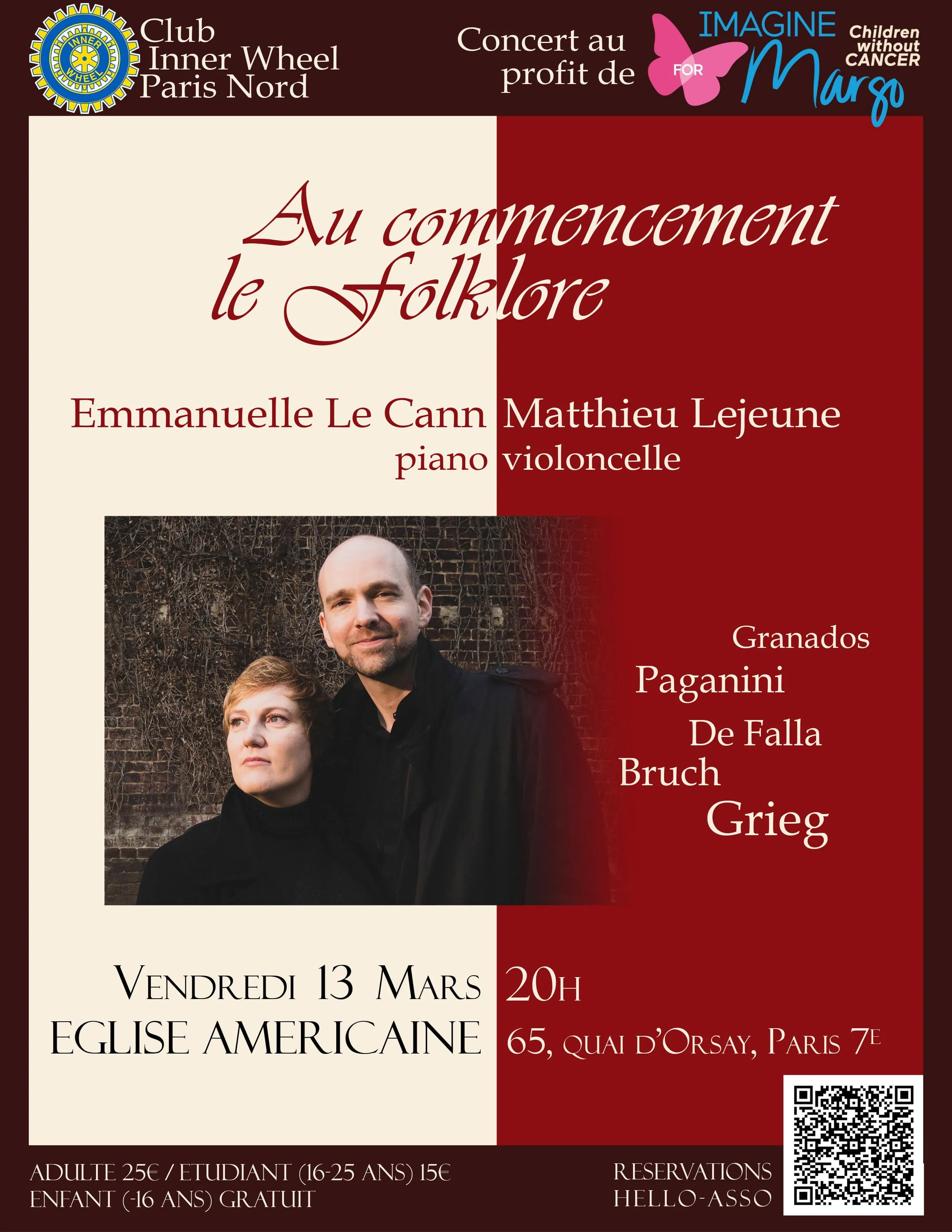 "Au commencement le Folklore" : la pianiste Emmanuelle Le Cann et le violoncelliste Matthieu Lejeune joueront des oeuvres de Granados, Paganini, De Falla, Bruch, Grieg. Ce concert est organisé par le Club Inner Wheel Paris-Nord au profit de l'Association "Imagine for Margo" qui oeuvre pour la recherche sur les cancers pédiatriques